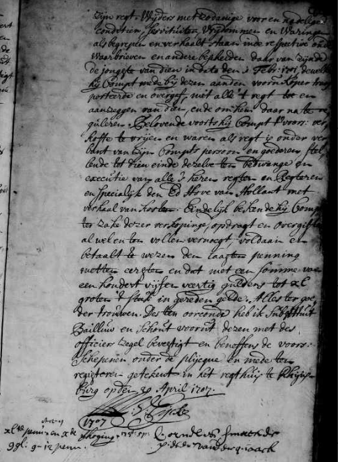 belent ten oosten de lange vaart, ten zuiden Claas Boudewijnge Coddeus , ten Regten zekere gemenelaan , en ten noorden Jacob Samuel Brussée , ende dat met de belastinge van agt gulden ‘s jaars erfpagt aankomende de Heeren Druivestein en de Weduwe Batin , ‘ t jaar 1706 tot lasten van de koper komen zal , voorts — vrij als buurhuizen en erven , behouden den heer zijn regt . wijders met zodanige voor en nadeelige conditien , servituten, Vrijdommen en Waringen als begrepen en verhaalt staan in de respectiveoud waarbrieven en andere bescheiden daarvan zijnde 6 de jongste van dien in dato den 11 Febr : 1701 , dewelk hij Comp(aran)t mede bij dezen aan den voorn. koper posteerde en overgaf , met alle ‘t regt toe en aanzeggen van dien, ende om hem daar na te reguleren. Belovende voorts hij Compt voors : verkoste te vrijen en waren als regt is onder verbant van zijn Compts persoon en goederen , stellende tot dien einde dezelve ten bedwange en executie van alle ‘s heren regter en Regteren en specialijk den Ed(ele) Hove van Hollant met verhaal van kosten . Eindelijk bekende hij Comp(arant) ter zake dezer verkopinge , opdragt en overgifte al wel en ten vollen vernoegt , voldaan en betaalt te wezen den laasten penning metten eersten en dat met een somme van een hondert vijfen veertig guldens tot de groten ’ t stuk in gereden gelde . Alles ter goeder trouw,en desen oorconde heb ik Substituit Bailluw en schout voorn(oemde) dezen met des officiers zegel bevestigt en beneffens de voors : schepenen onder de plijcque en mede ten registeren getekent in het regthuis te Rhijnburg op den 9 April 1707.
