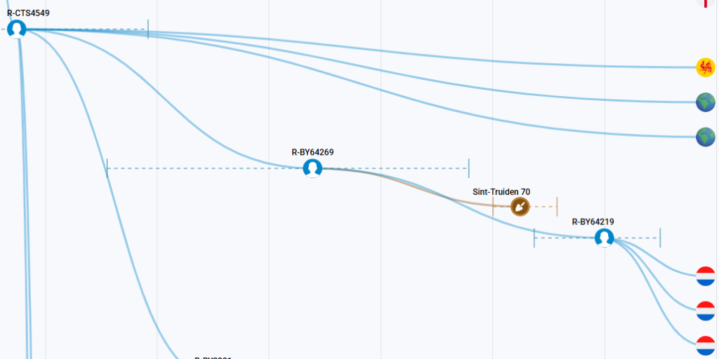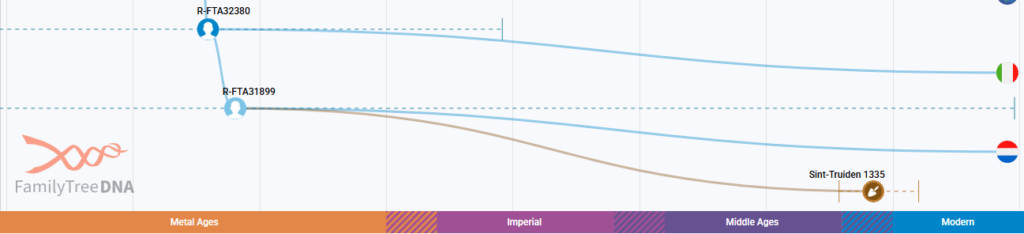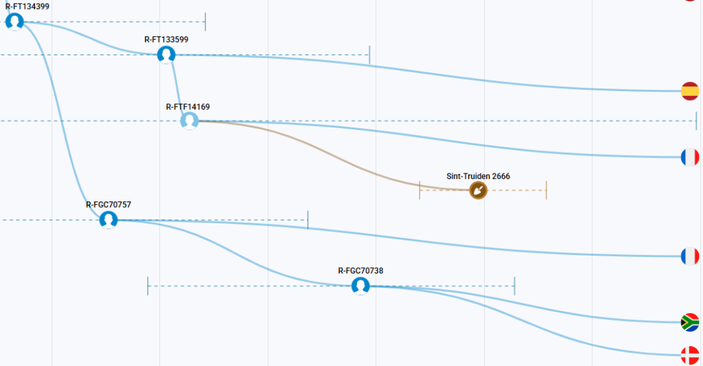 Onderstaande afbeelding toont de oud Y-dna match tussen een archeologisch graf te Sint Truiden met SNP FTF14169 en een Franse nog onbekende familie. De match heeft ook betrekking op families in Spanje, Denemarken en Zuid-Afrika (geëmigreerd vanuit Nederland).
