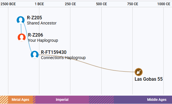 De gezamenlijke voorvader leefde rond 1500 voor Christus. Het Y-dna van de Las Gobas man geeft nog meer jongere SNP’s prijs, waaronder SNP CTS606, ontstaan rond 1200 v.Chr. Deze SNP is ook gevonden in het vikinggraf te Oxford, Engeland en in het Deense graf te Tjaerby. Zie afbeeldingen bij de vikingraven aan het einde van deze pagina.